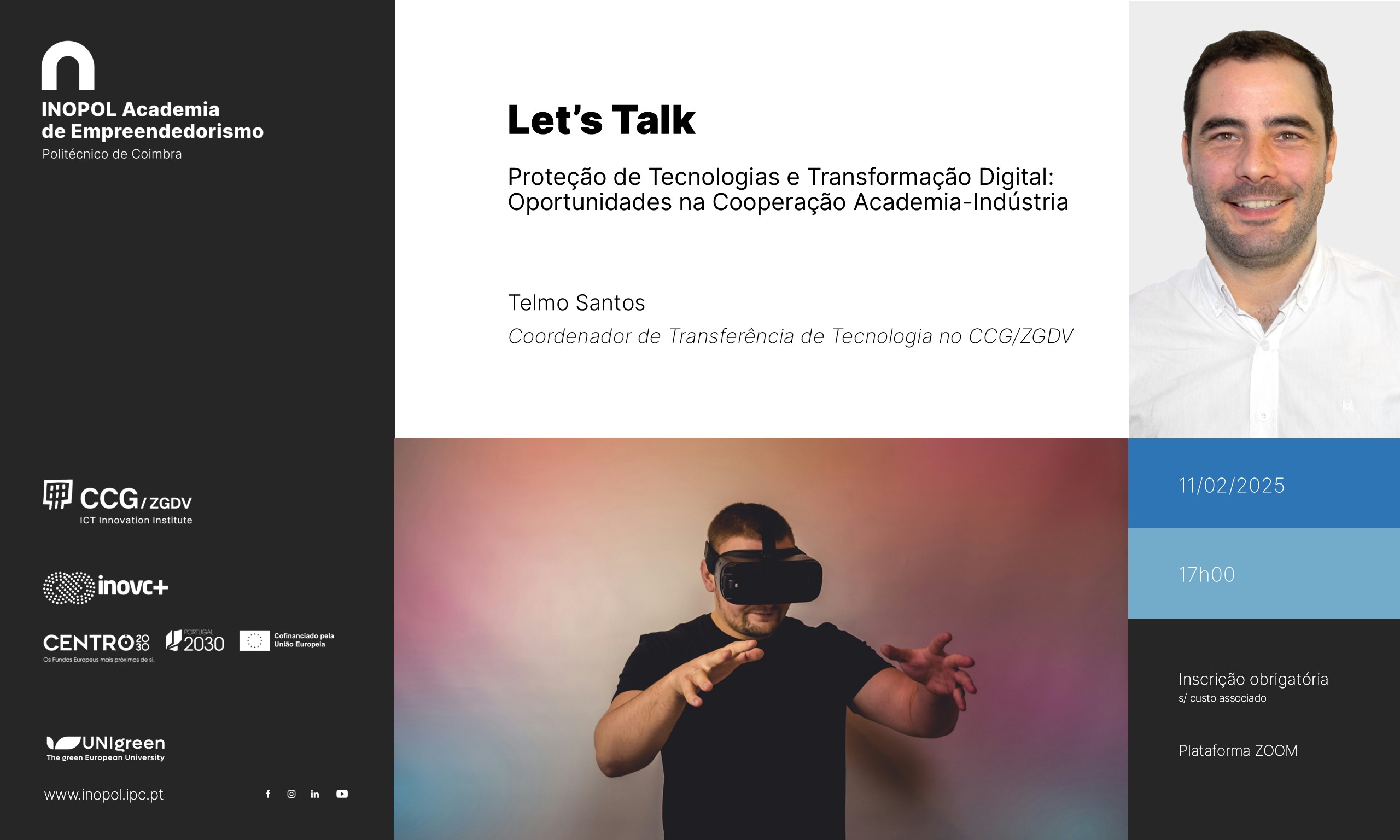 Nesta edição, o convidado é Telmo Santos, responsável pelo gabinete de Transferência de tecnologia (TTO) do CCG/ZGDV Institute, um instituto de investigação aplicada sediado em Guimarães que promove a inovação no domínio das Tecnologias de Informação e Comunicação (TIC) , através da conceção e prototipagem de novos processos, serviços e produtos de elevado valor.