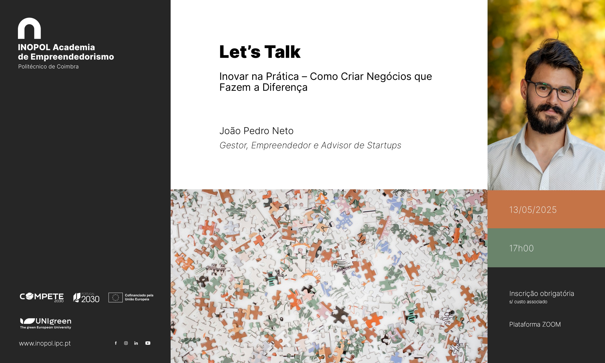Este Let’s Talk é para todos os que estão a dar os primeiros passos no empreendedorismo, a desenvolver um projeto ou a explorar como transformar uma ideia num negócio real — dentro ou fora do meio académico.
