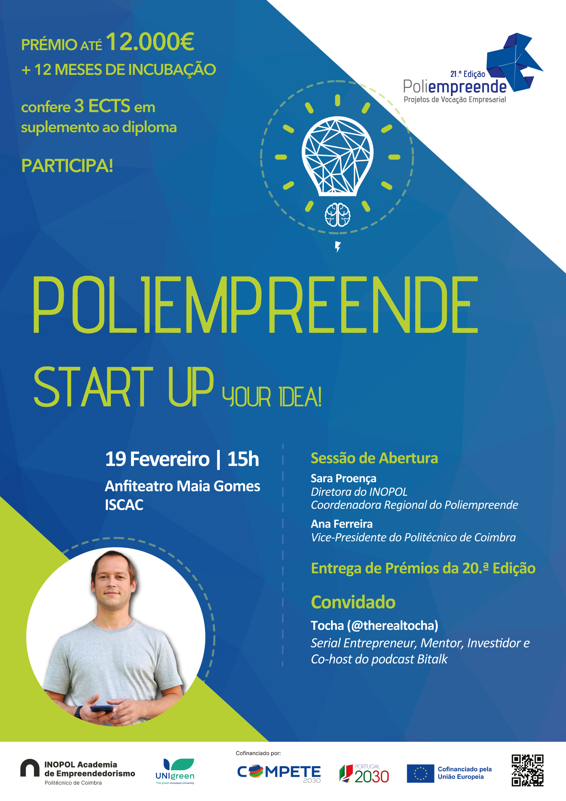 📆 Se quiseres saber mais sobre o programa deste ano, não percas a Sessão de Abertura “𝐏𝐨𝐥𝐢𝐞𝐦𝐩𝐫𝐞𝐞𝐧𝐝𝐞 – 𝐒𝐭𝐚𝐫𝐭 𝐔𝐩 𝐘𝐨𝐮𝐫 𝐈𝐝𝐞𝐚”, que acontece já no próximo dia 𝟭𝟵 𝗱𝗲 𝗳𝗲𝘃𝗲𝗿𝗲𝗶𝗿𝗼, pelas 𝟭𝟱𝗵𝟬𝟬, no Anfiteatro Maia Gomes da Coimbra Business School | ISCAC.