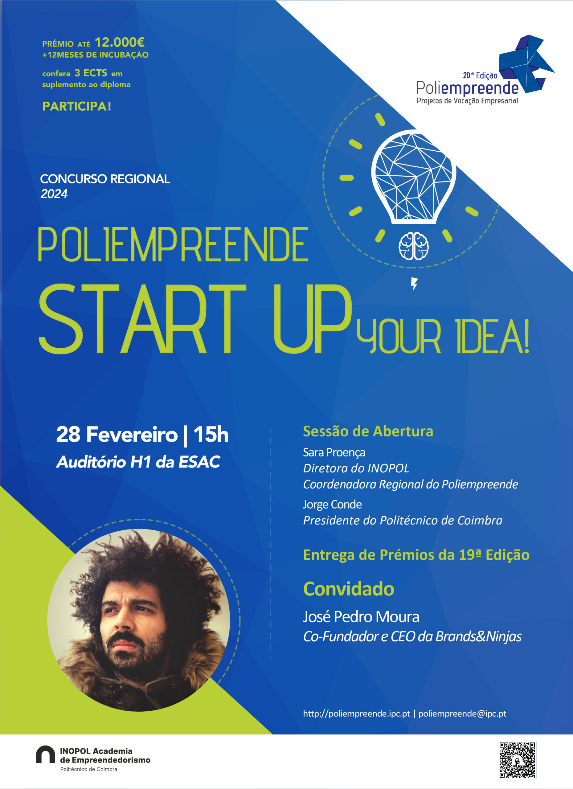 🔊 A sessão contará com as intervenções de Sara Proença, Diretora do INOPOL Academia de Empreendedorismo e Coordenadora Regional do Poliempreende, de Jorge Conde, Presidente do Politécnico de Coimbra e com a palestra do convidado José Pedro Moura, Co-Fundador e CEO da Brands&Ninjas. Durante o evento, terá ainda lugar a entrega dos prémios referentes à 19.ª edição do programa.